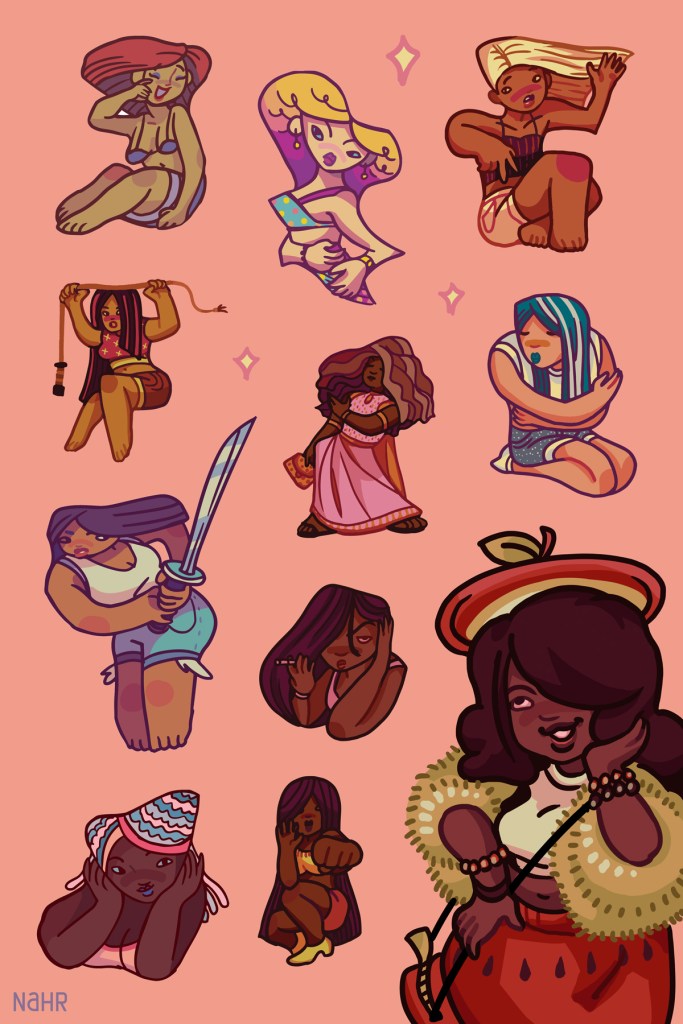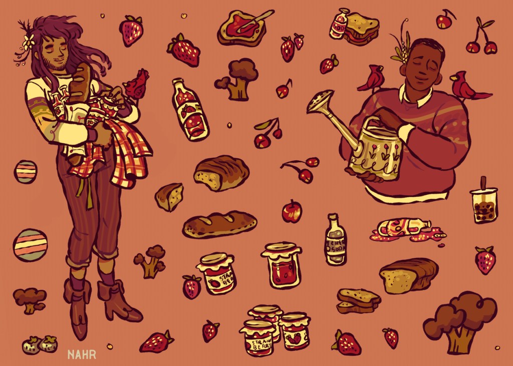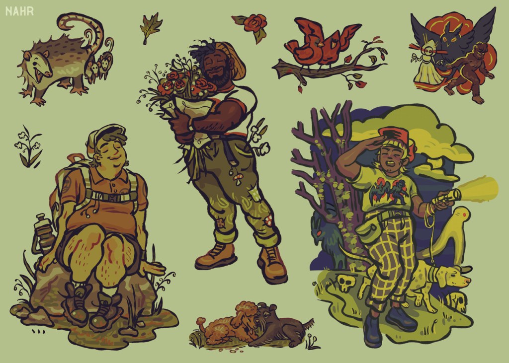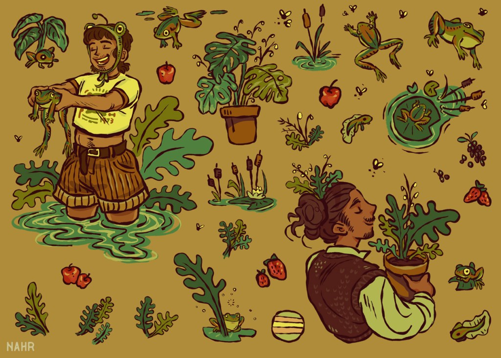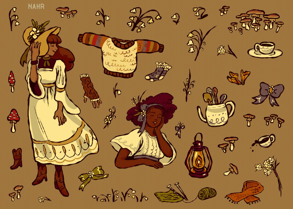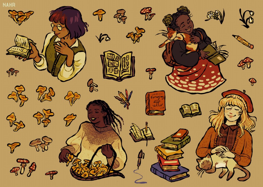 Cottagecore/autumnal/outdoorsy aesthetics inspired and made with LGBTQ users of Pinterest, Tumblr, and TikTok in mind– a diverse group that shares a love for nature, DIY, and niche fashion. Chunky outlines and earthy palettes tie the set together. Stickers would be kiss cut and collected into a booklet. Ideal for journaling, scrapbooking, and sending to friends.