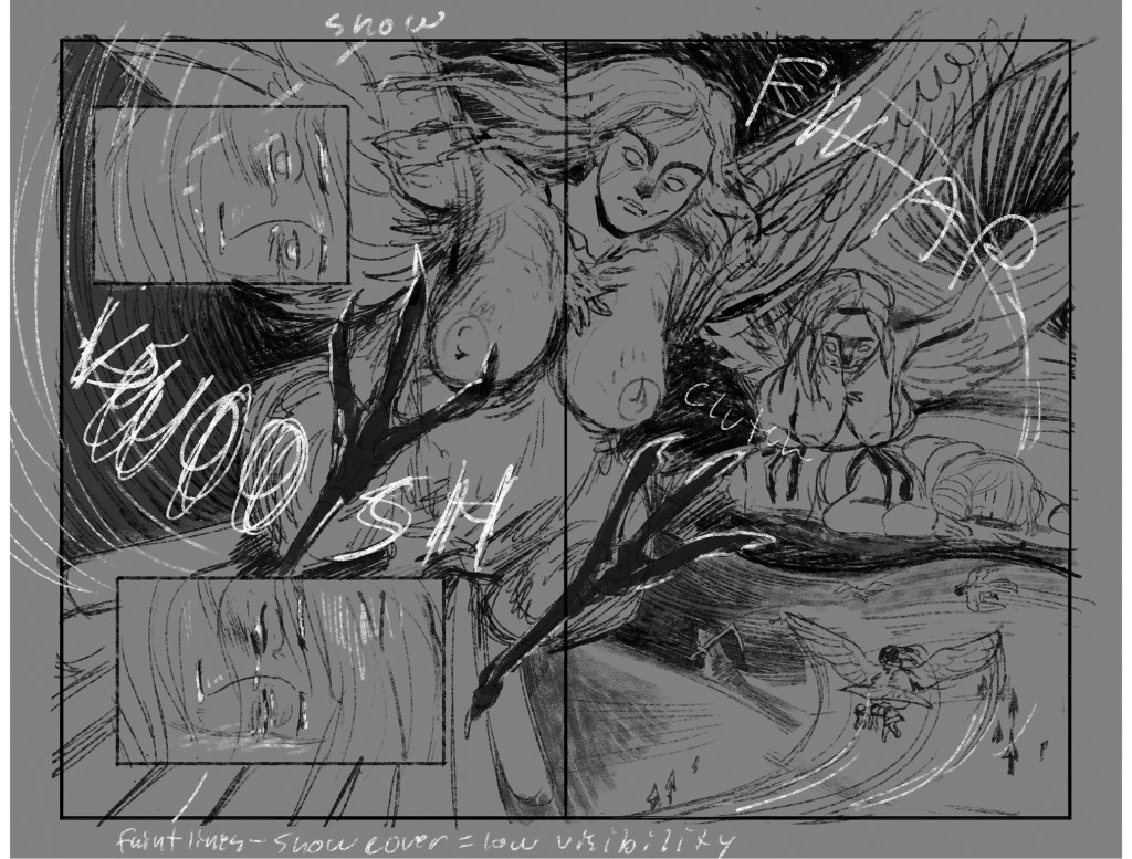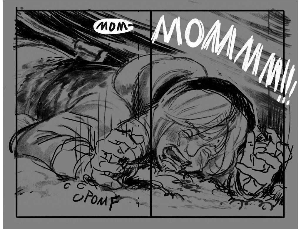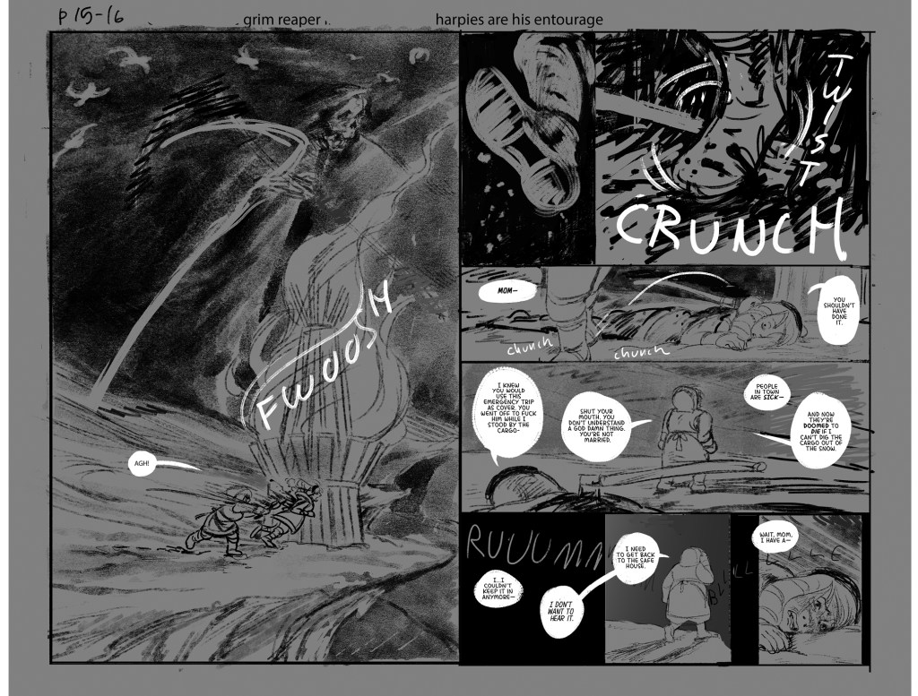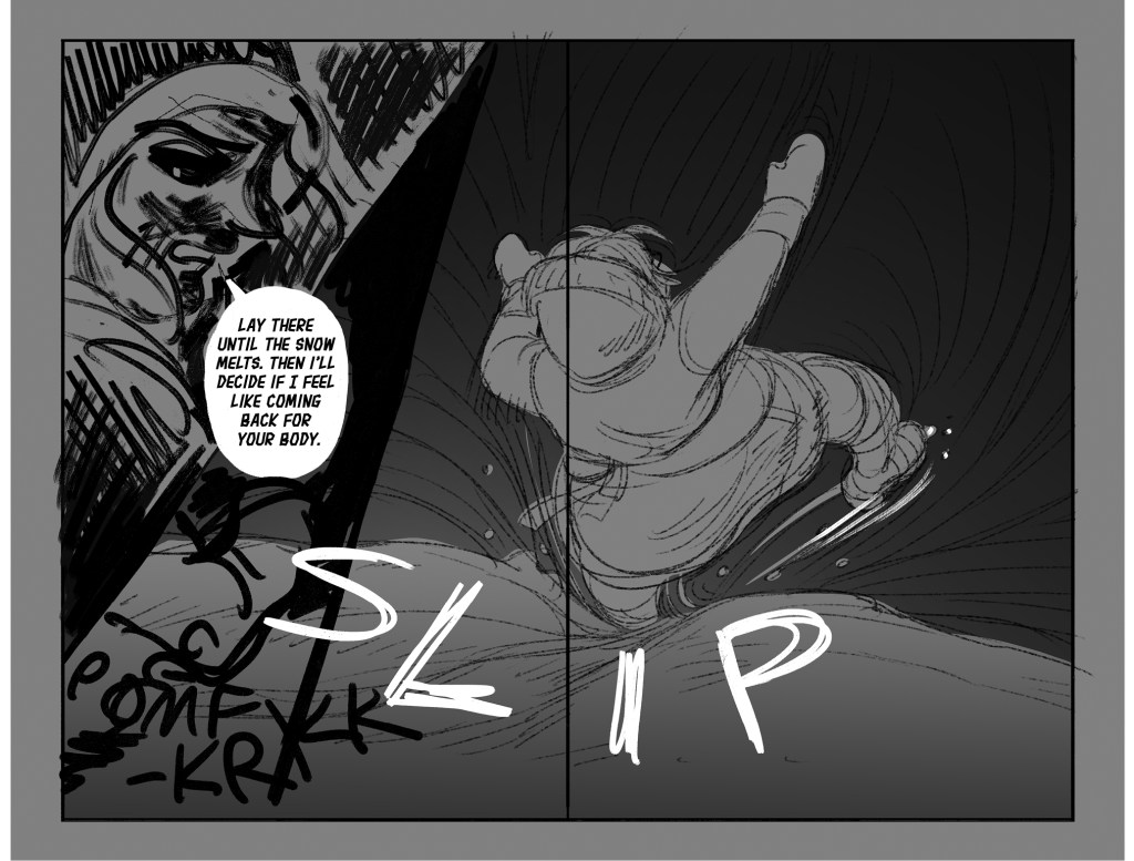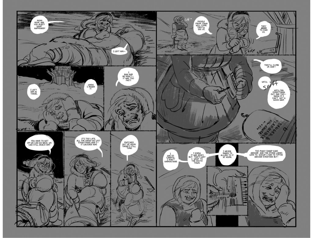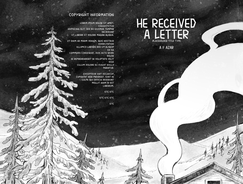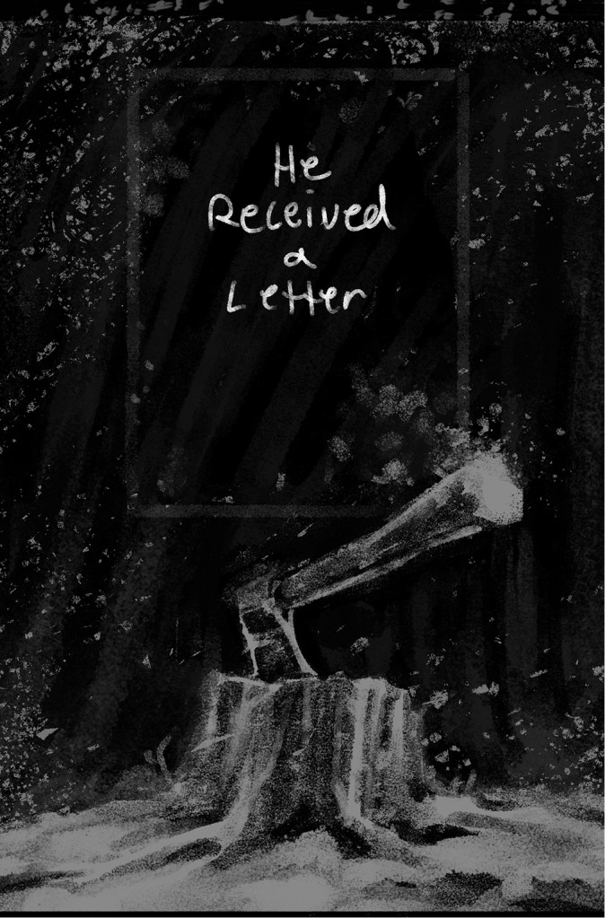 He Received a Letter is an unfinished short comic about the disastrous aftermath of when Mona—a young woman who makes supply deliveries between distant mountain villages with her mother—writes a letter to her father informing him of her mother’s infidelity at work. She slips it in the mailbox on the eve of an important run that includes picking up life-saving medicine for sick residents of their isolated home town, expecting the issue to be addressed after the journey. Instead, her father climbs the mountain to confront them at the last rest stop on their return—when an avalanche crashes down on the argument. The comic features nonlinear storytelling, traditional line work finished with textured digital tones, and a sense of doom that underscores the cruelty of each character’s actions.