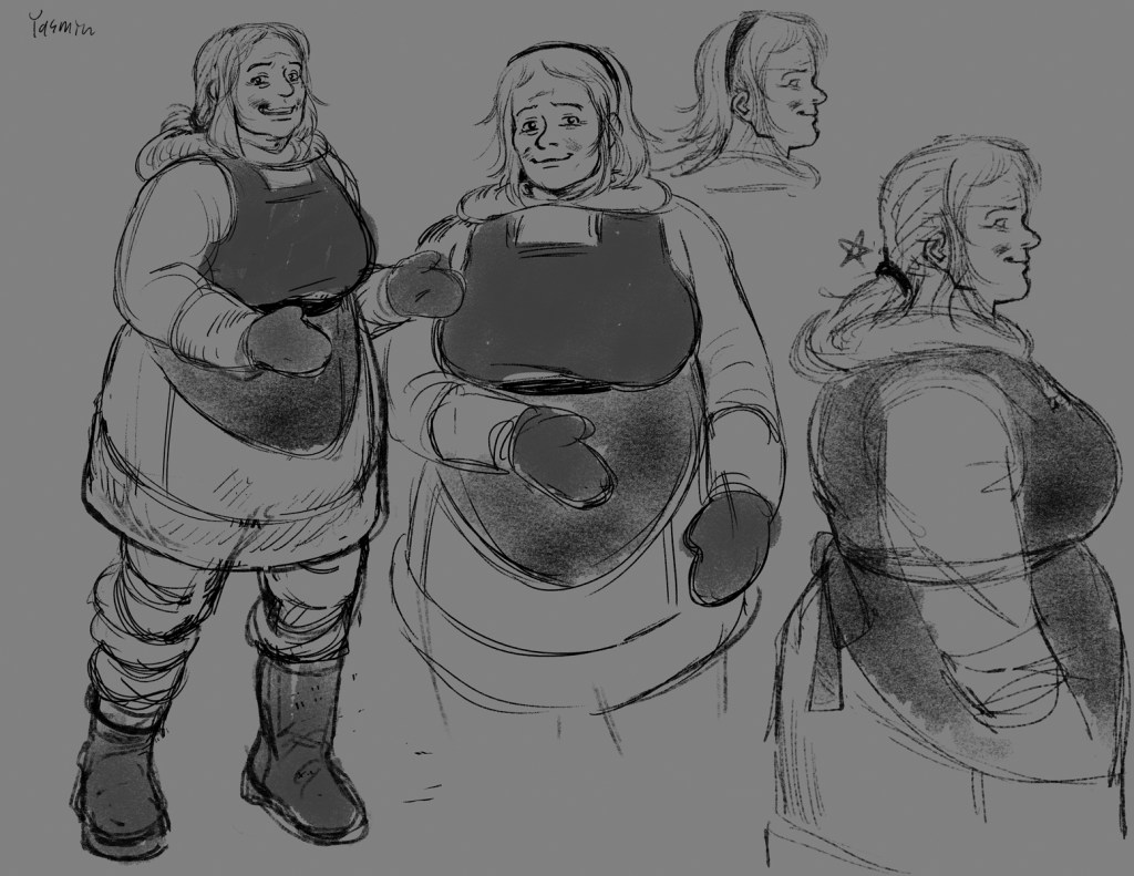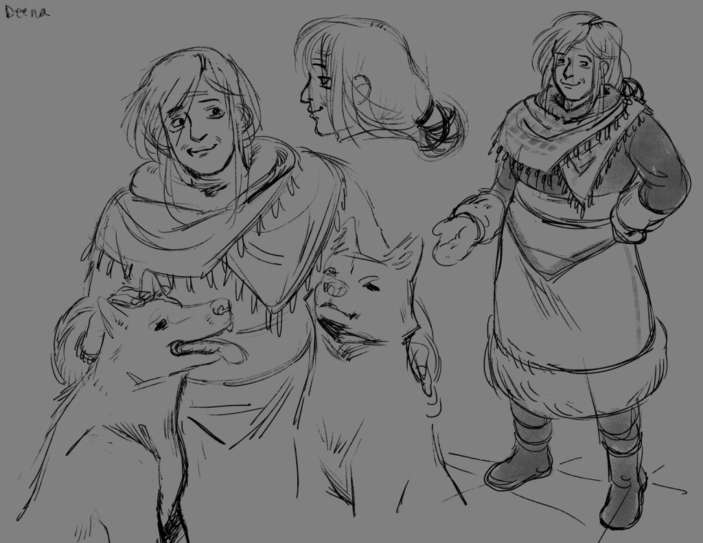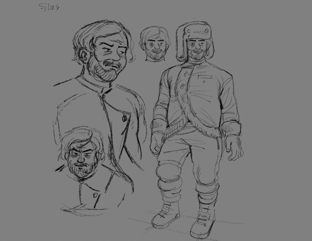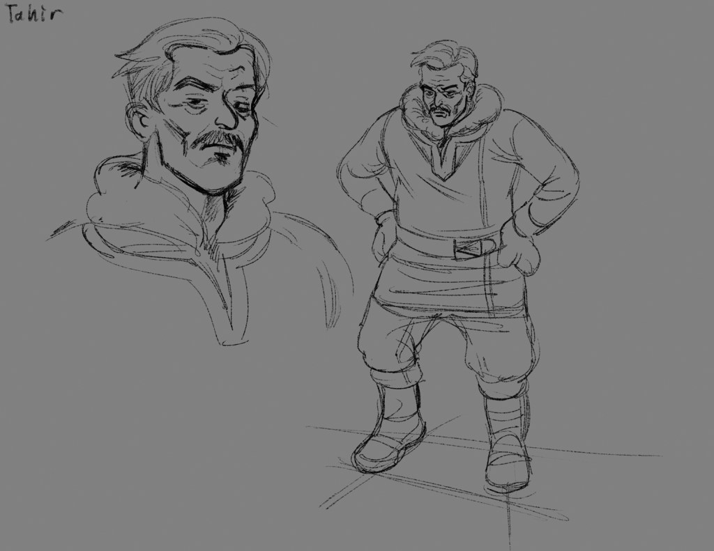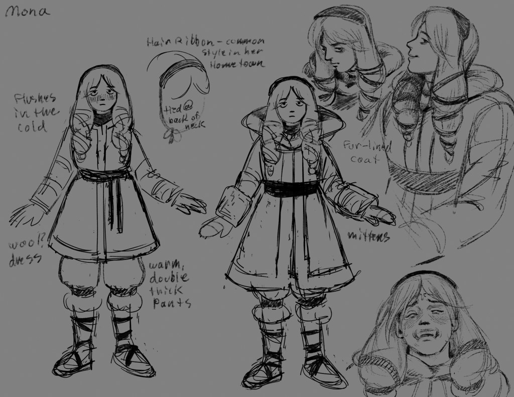 Character designs, including two characters that were cut from the original draft.